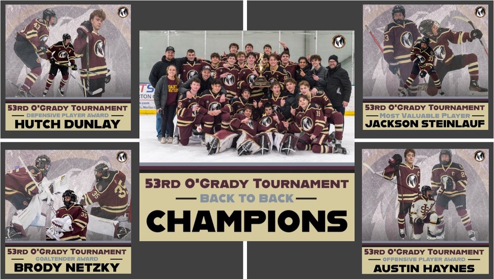 Back to Back Champions! Saint Ignatius Varsity Gold wins the 2024 O'Grady Thanksgiving Tournament for the second year in a row in dramatic fashion beating New Trier Green 2-1 in 5OT! Varsity Gold went 5-0 while outscoring opponents 24-6. Congratulations to all of our coaches and players as well as those that were recognized with outstanding performances!